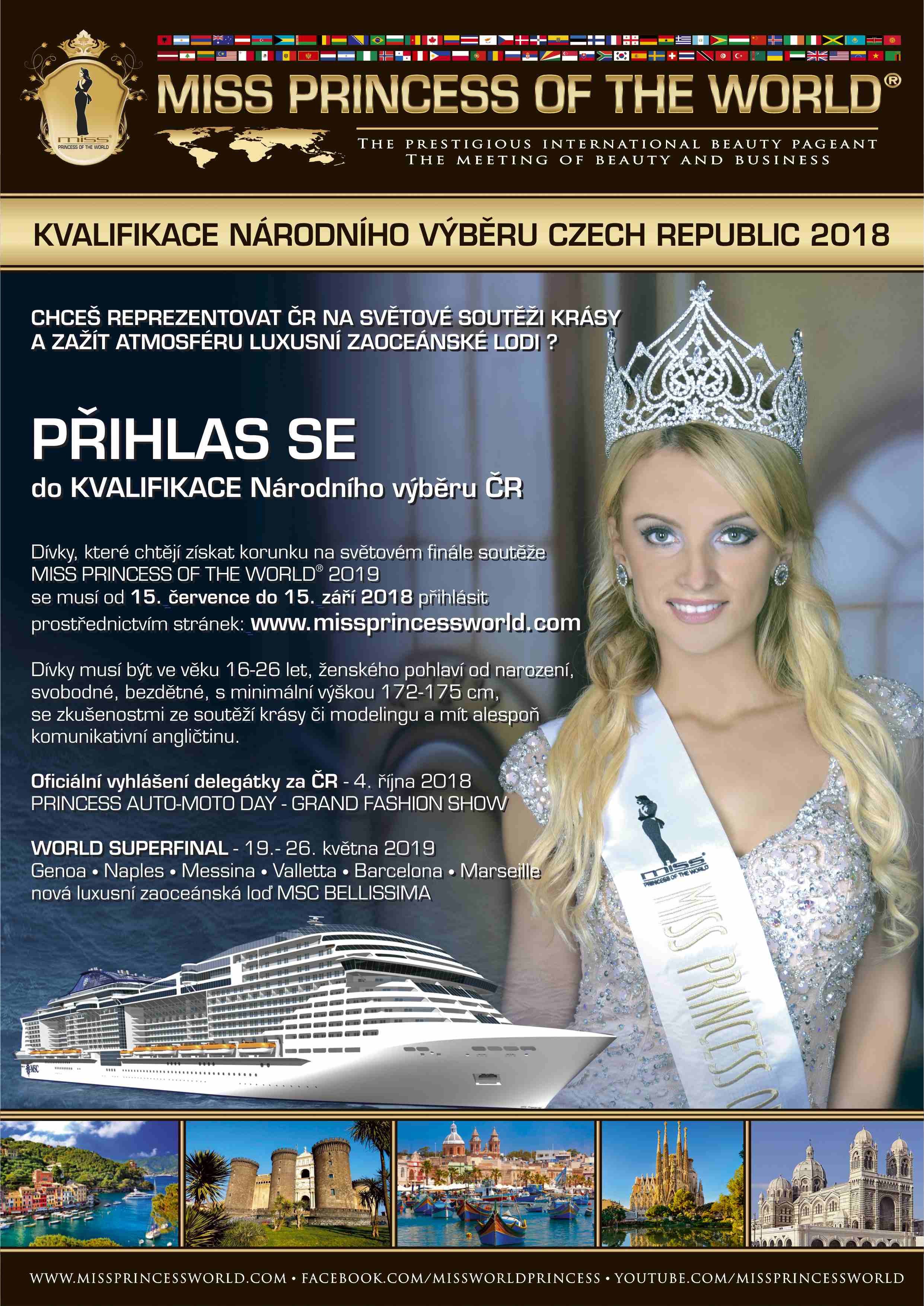 Vážené dívky a vážení organizátoři soutěží MISS v České republice Upozorňujeme, že dne 15.9.2018 ve 24.00 hod SEČ končí KVALIFIKACE pro Českou republiku a tedy možnost přihlášení a delegování vašich dívek do mezinárodní Soutěže MISS PRINCESS OF THE WORLD® 2019 pro dívky ve věku 16 - 26 let.